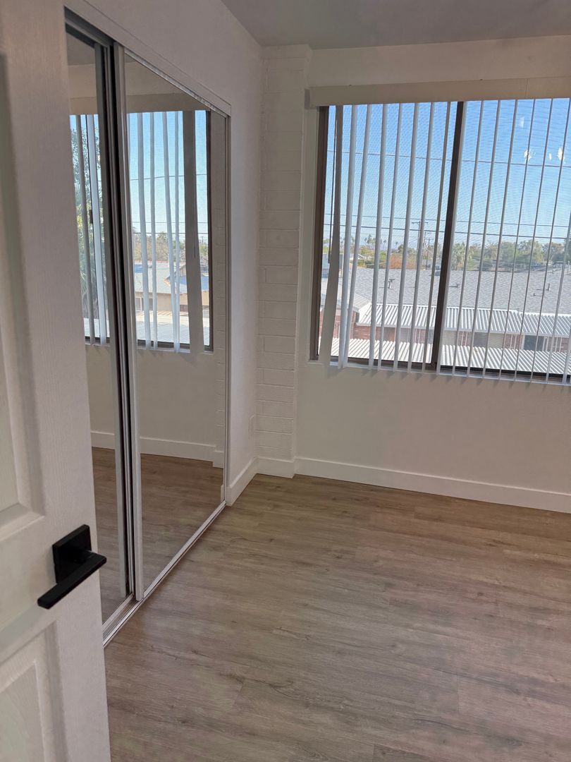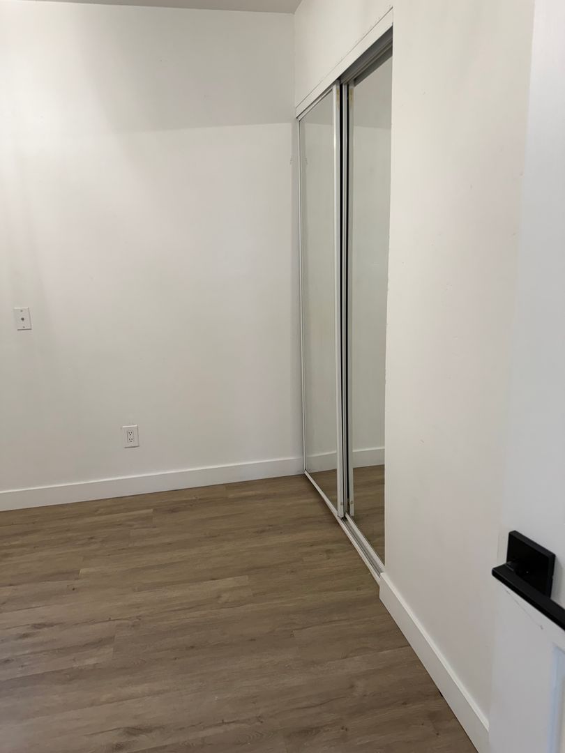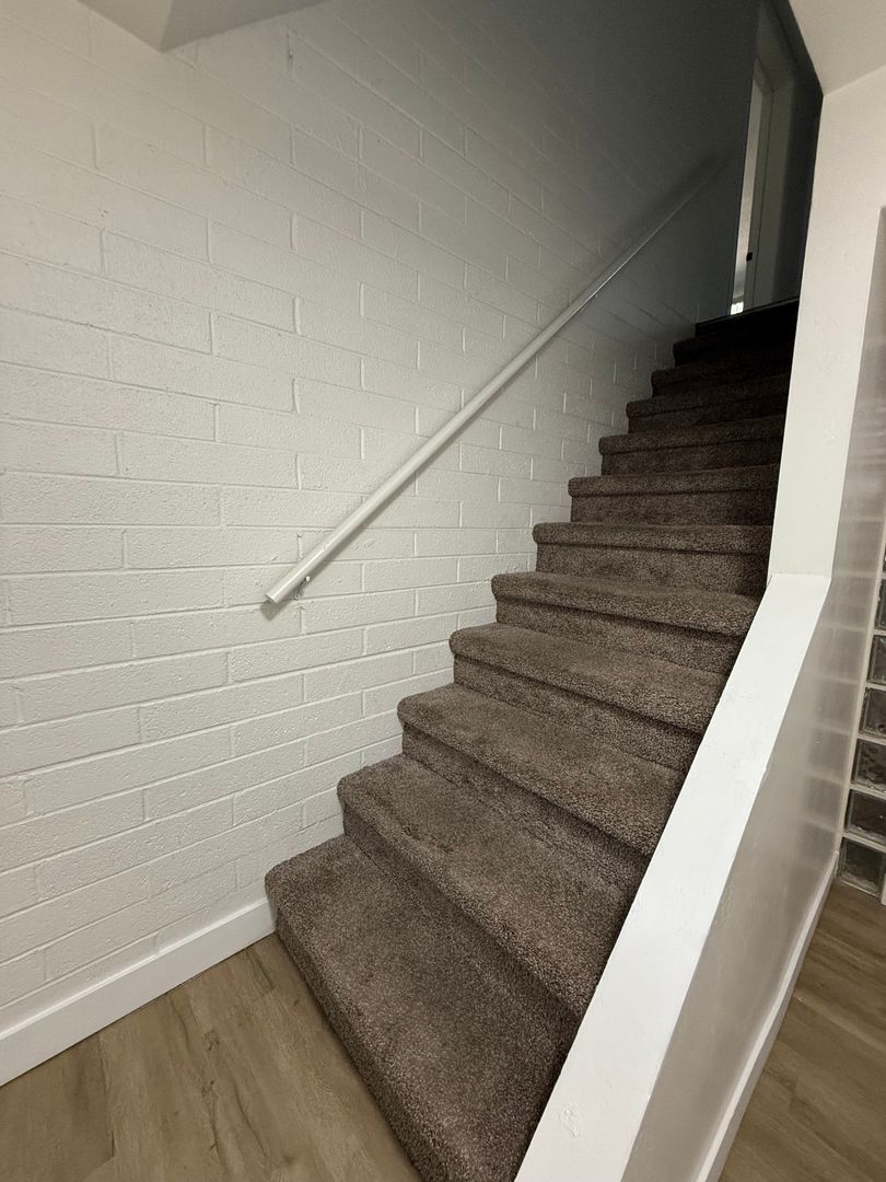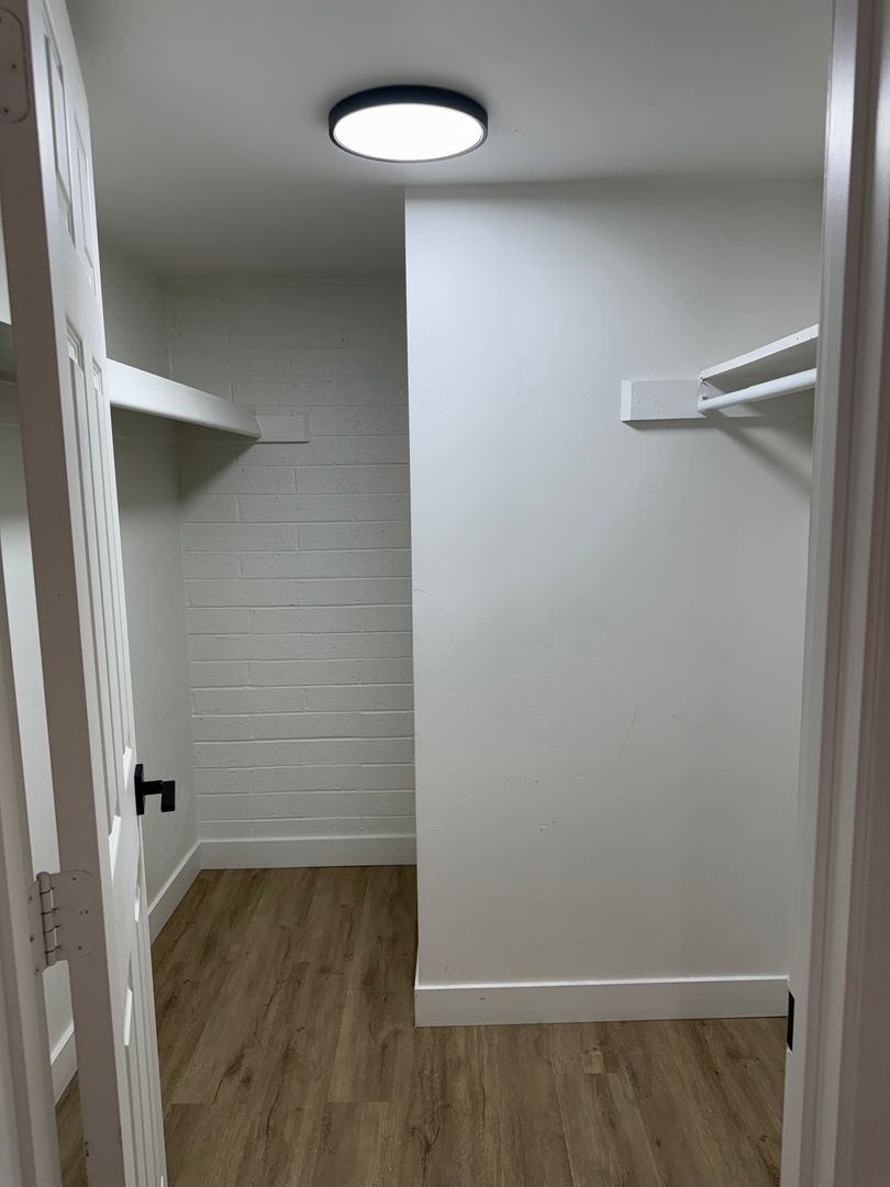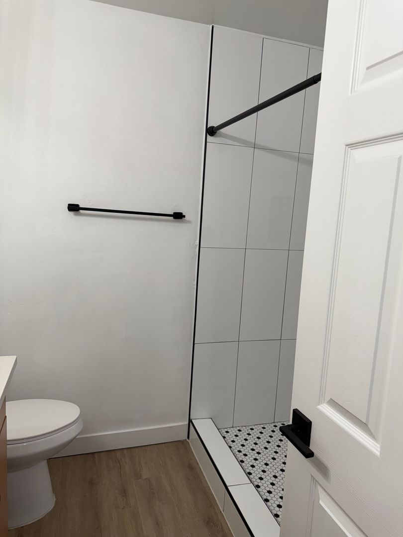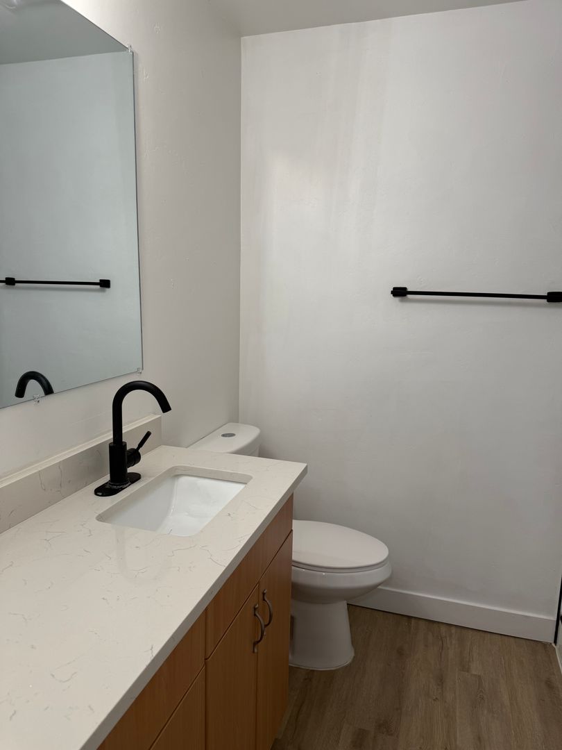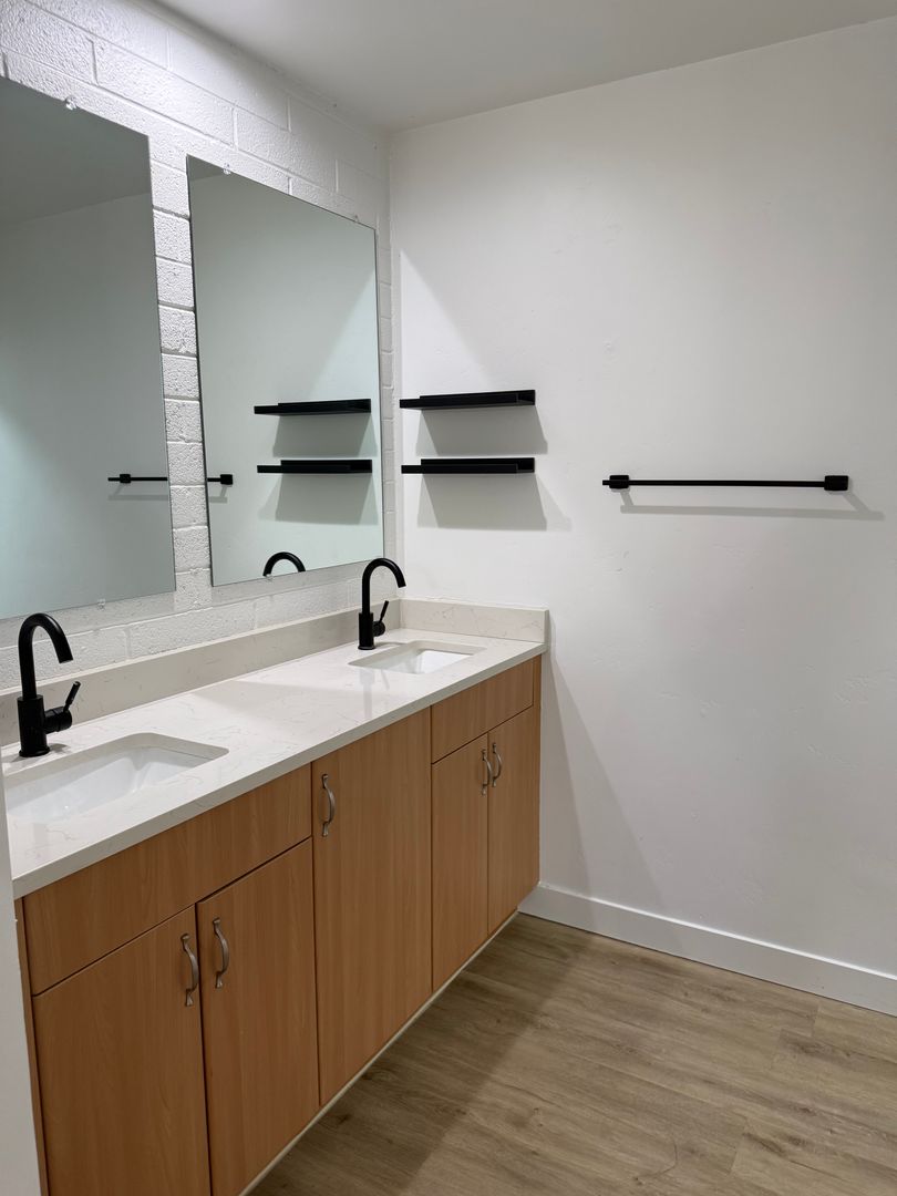 Upstairs, both bedrooms offer generous closet space and plenty of natural light. The bathrooms feature modern fixtures, designer lighting, a double vanity, and a tiled walk-in shower with bold black accents that elevate the space.