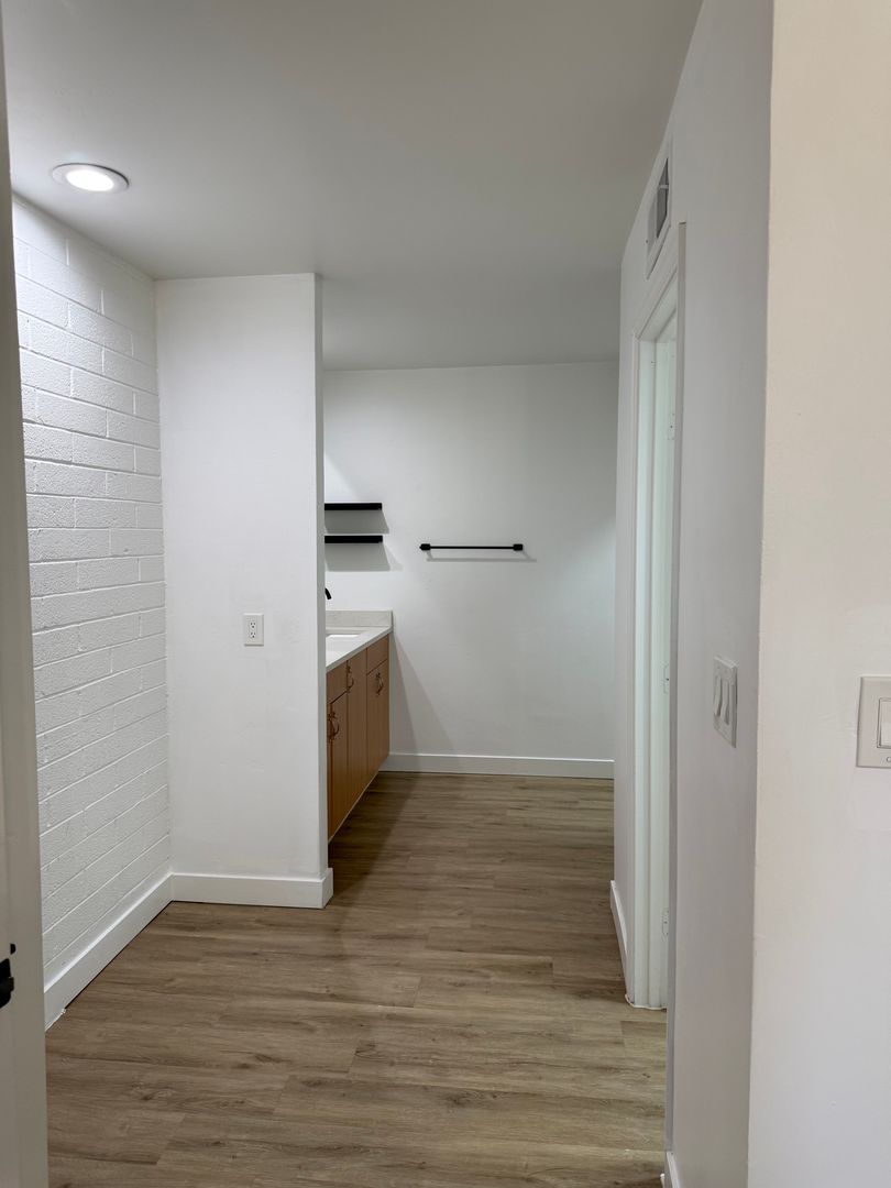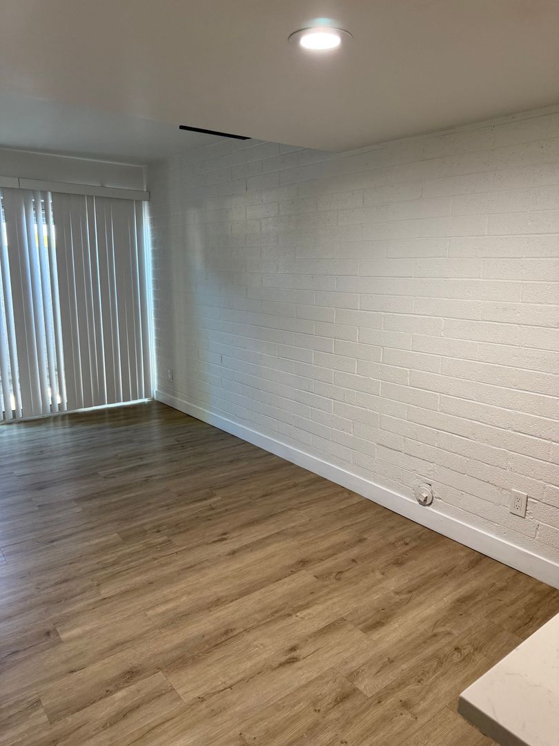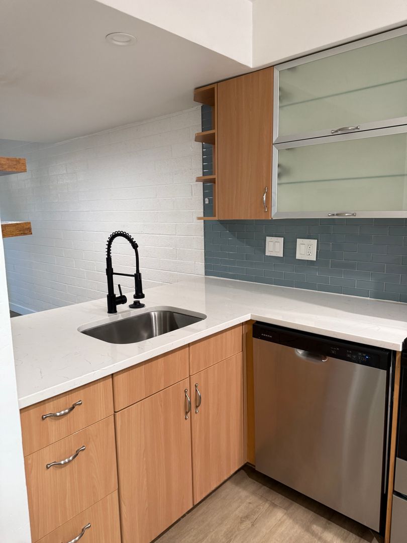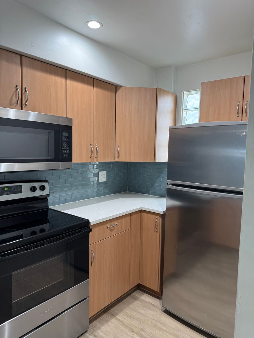 Step inside to discover a bright, open-concept living area featuring wood-style flooring, fresh paint, and sleek recessed lighting. The fully updated kitchen includes warm wood cabinetry, quartz countertops, a chic glass tile backsplash, and stainless steel appliances—ideal for cooking and entertaining.