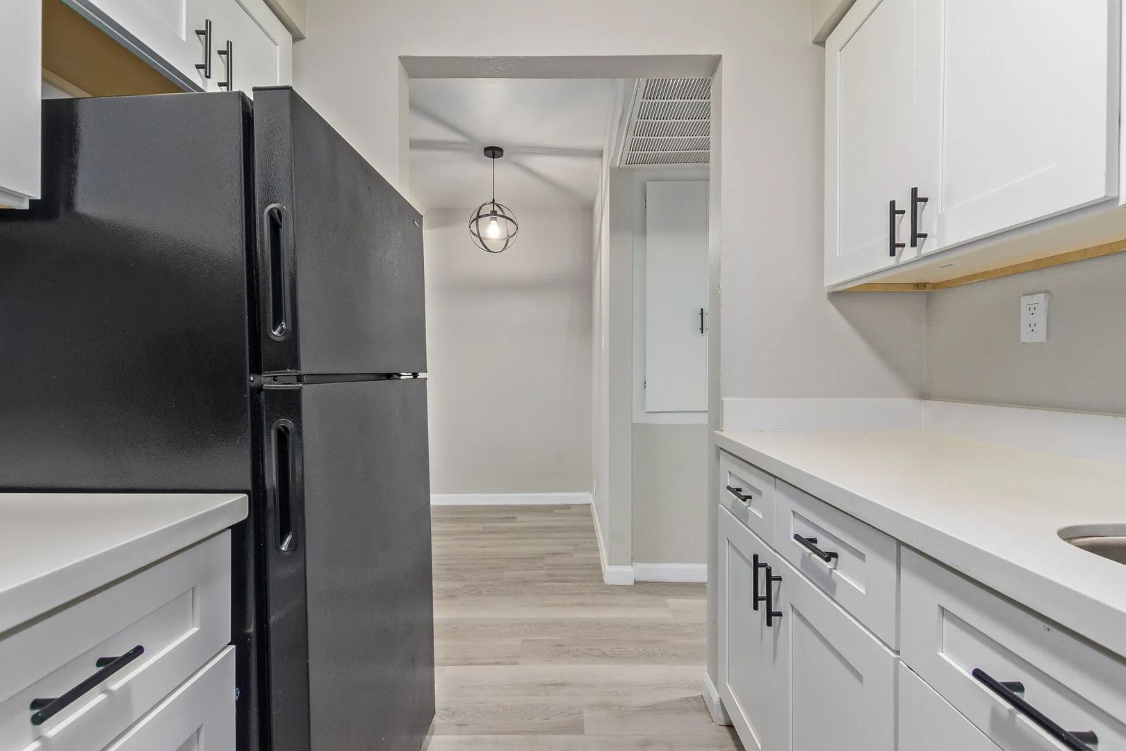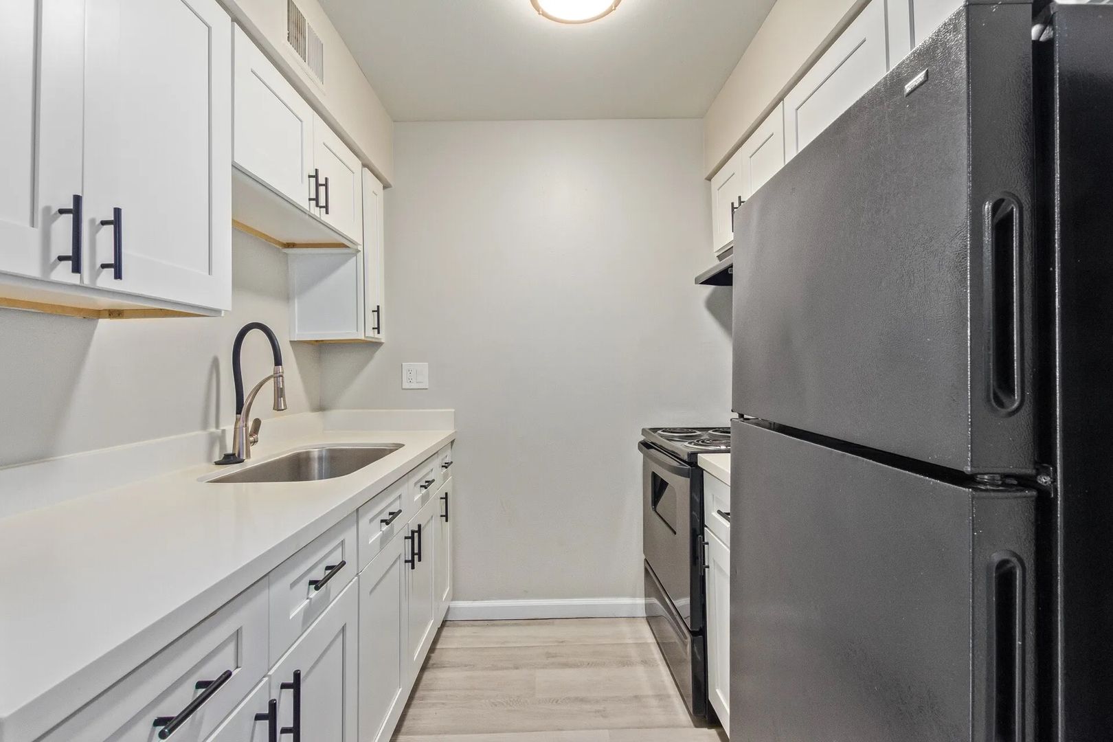 The kitchen features crisp white shaker cabinetry, bold black hardware, a gooseneck faucet, and sleek black appliances that create a trendy yet timeless aesthetic. The living and dining areas are open and inviting, with ample space for entertaining or relaxing at home. The bedroom is spacious and bright, with direct access to the bathroom and a large closet for storage.