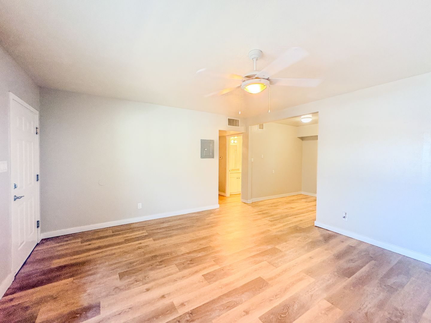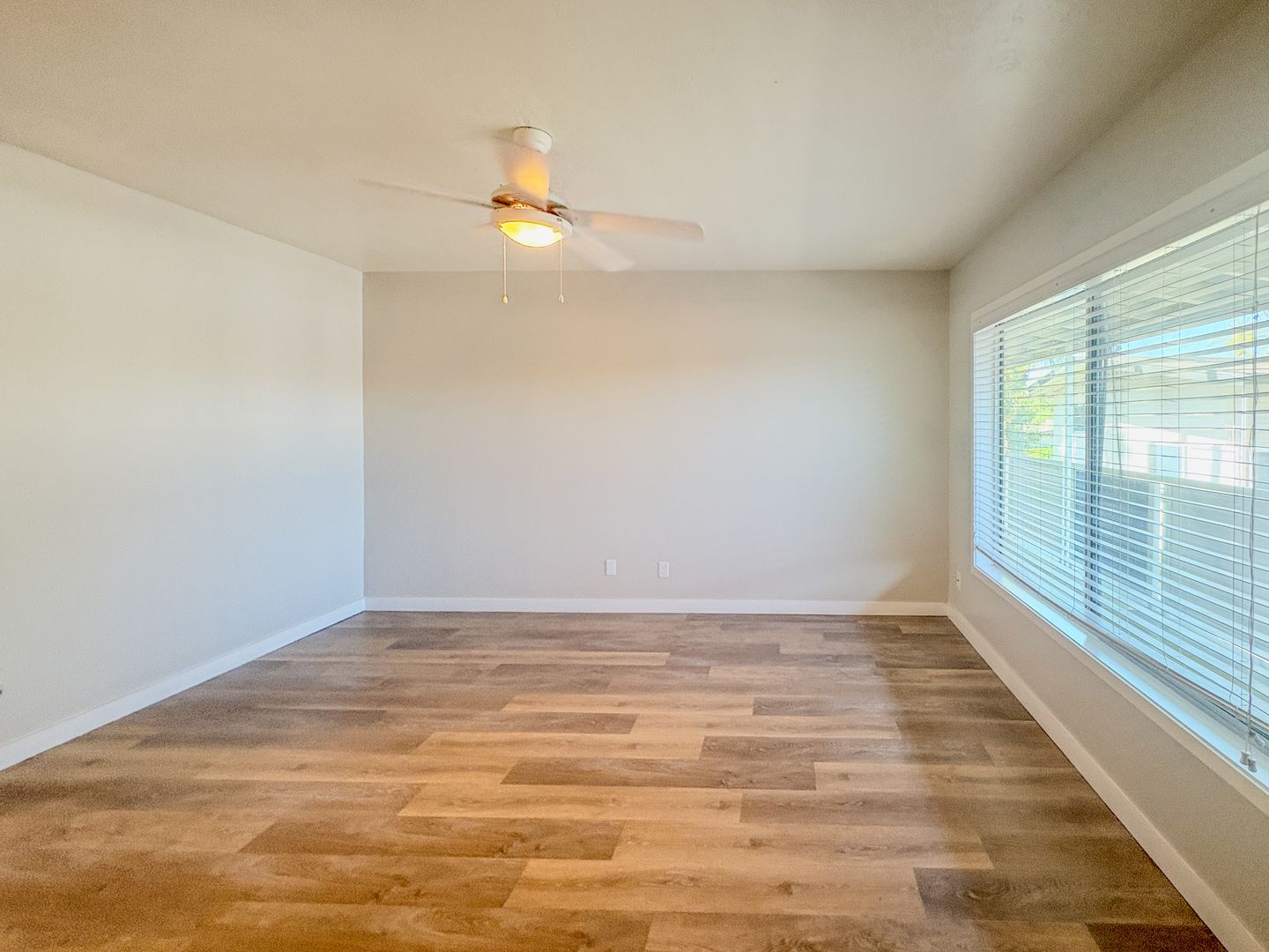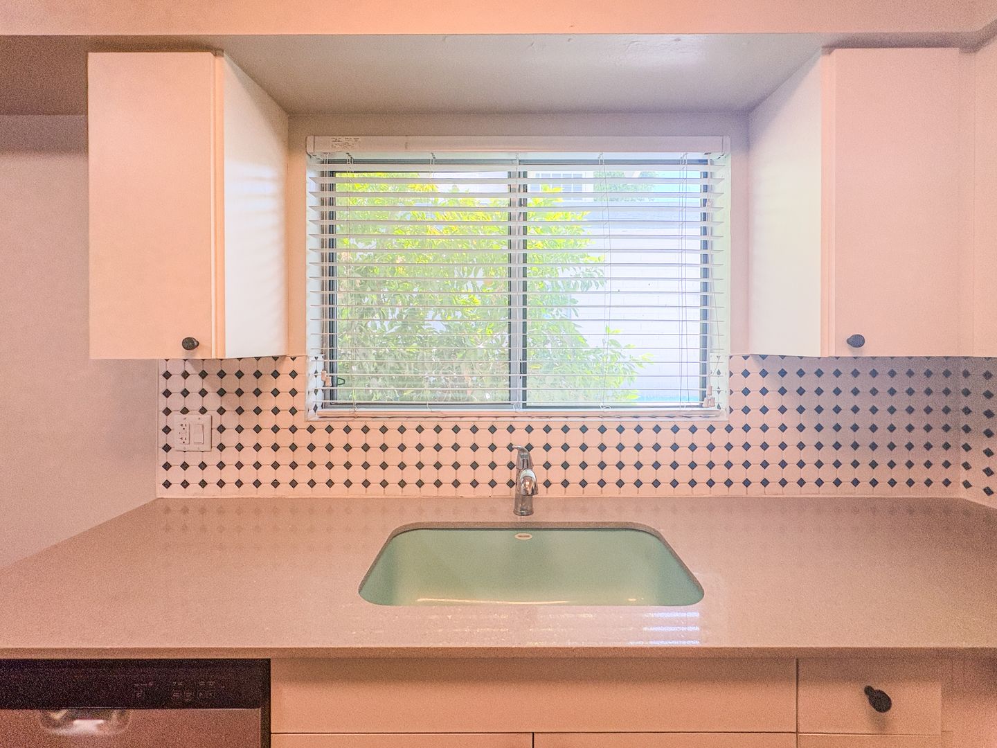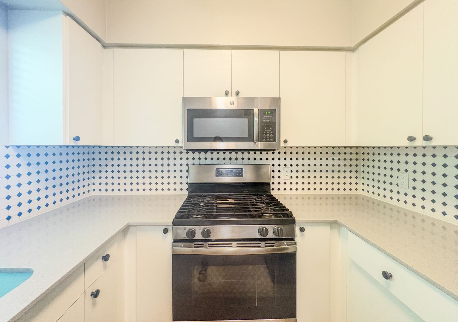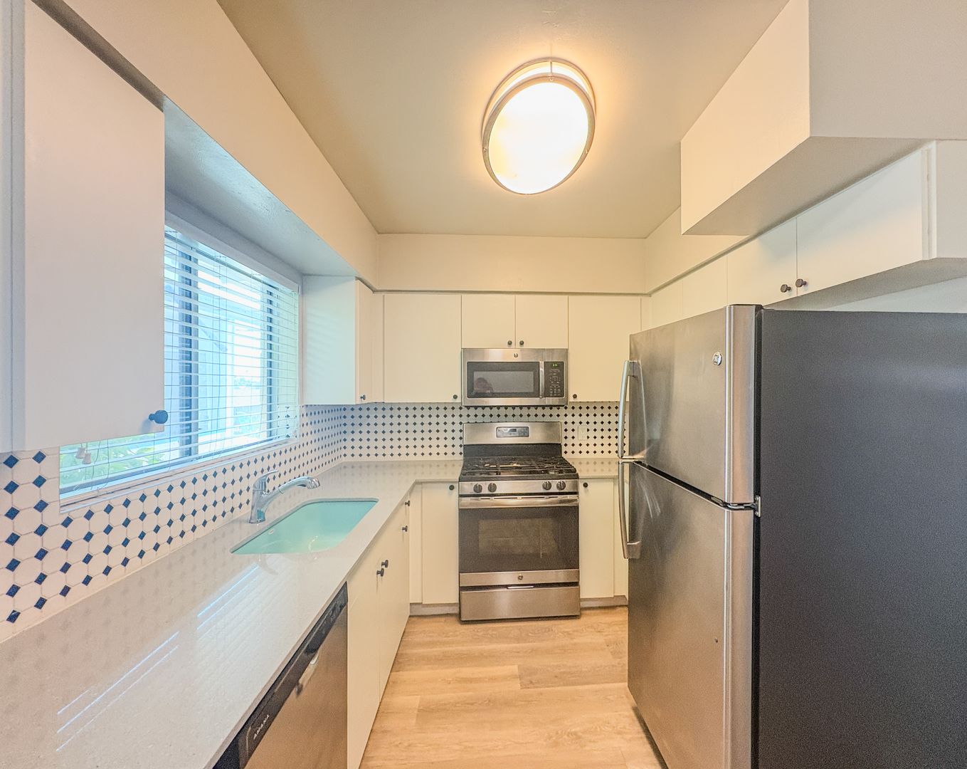 Step into a bright and open floor plan with wood-style flooring, fresh white paint, and modern ceiling fans throughout. The stunning kitchen features crisp white cabinetry, sleek quartz countertops, stainless steel appliances, and a unique black-and-white tile backsplash that adds a designer touch. Cook, entertain, and enjoy the natural light pouring through the oversized kitchen window.