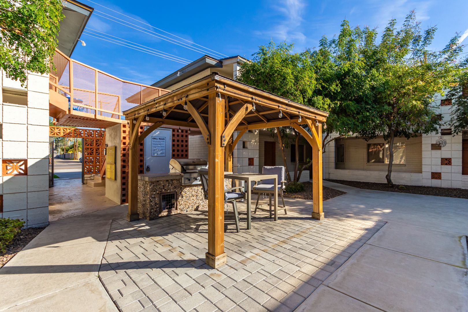 Relax and entertain under the community's charming wood pergola with built-in BBQ grill