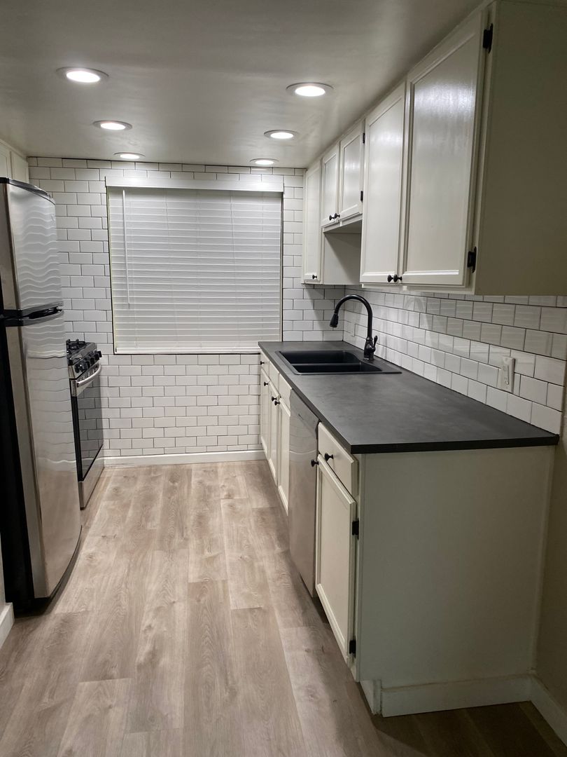Updated kitchen with subway tile backsplash, sleek black countertops, and stainless steel appliances