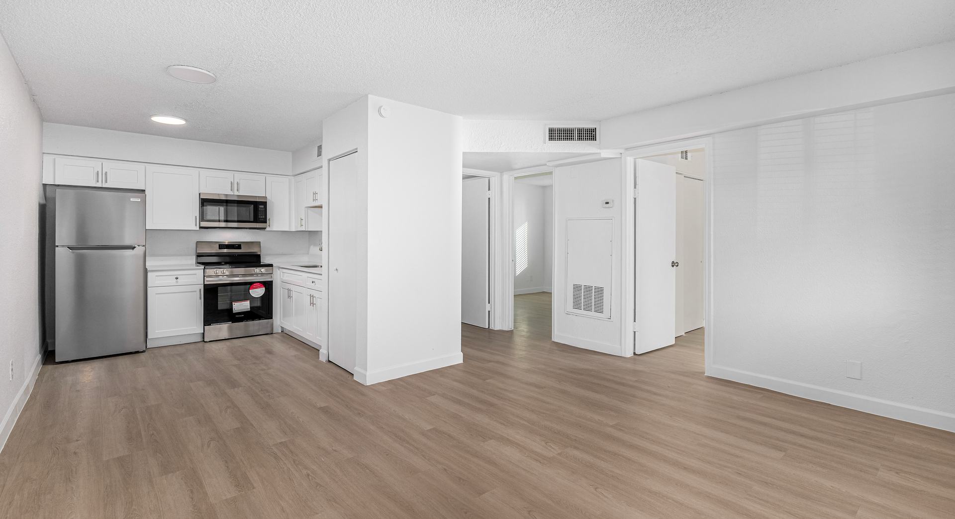 The fully updated kitchen includes sleek white cabinetry, modern countertops, stainless steel appliances, and ample storage, making meal preparation both convenient and enjoyable. The open living and dining area provides plenty of space for relaxing or entertaining.