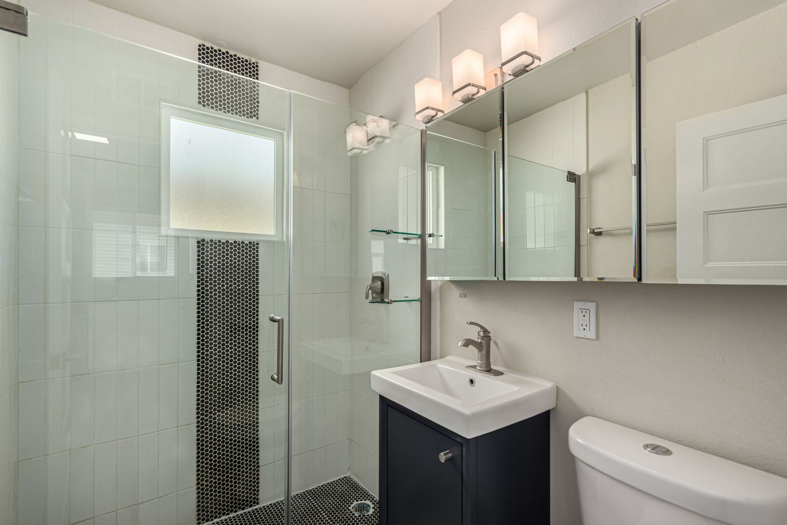Beautifully renovated bathroom with sleek tile work, glass shower doors, and modern fixtures