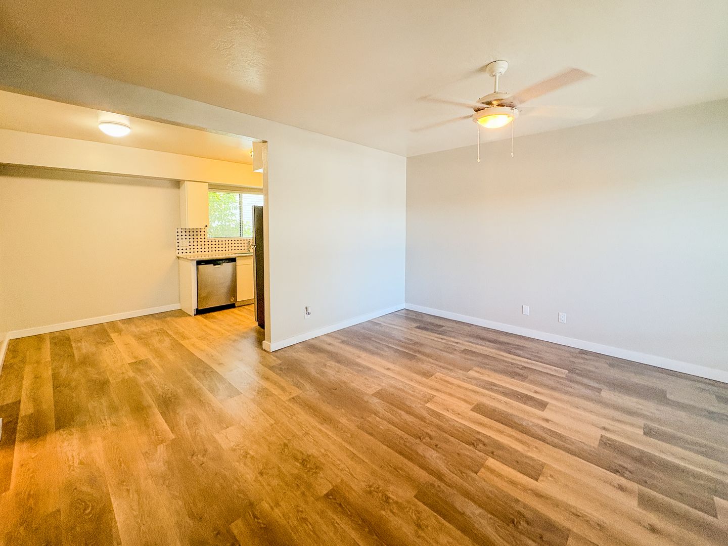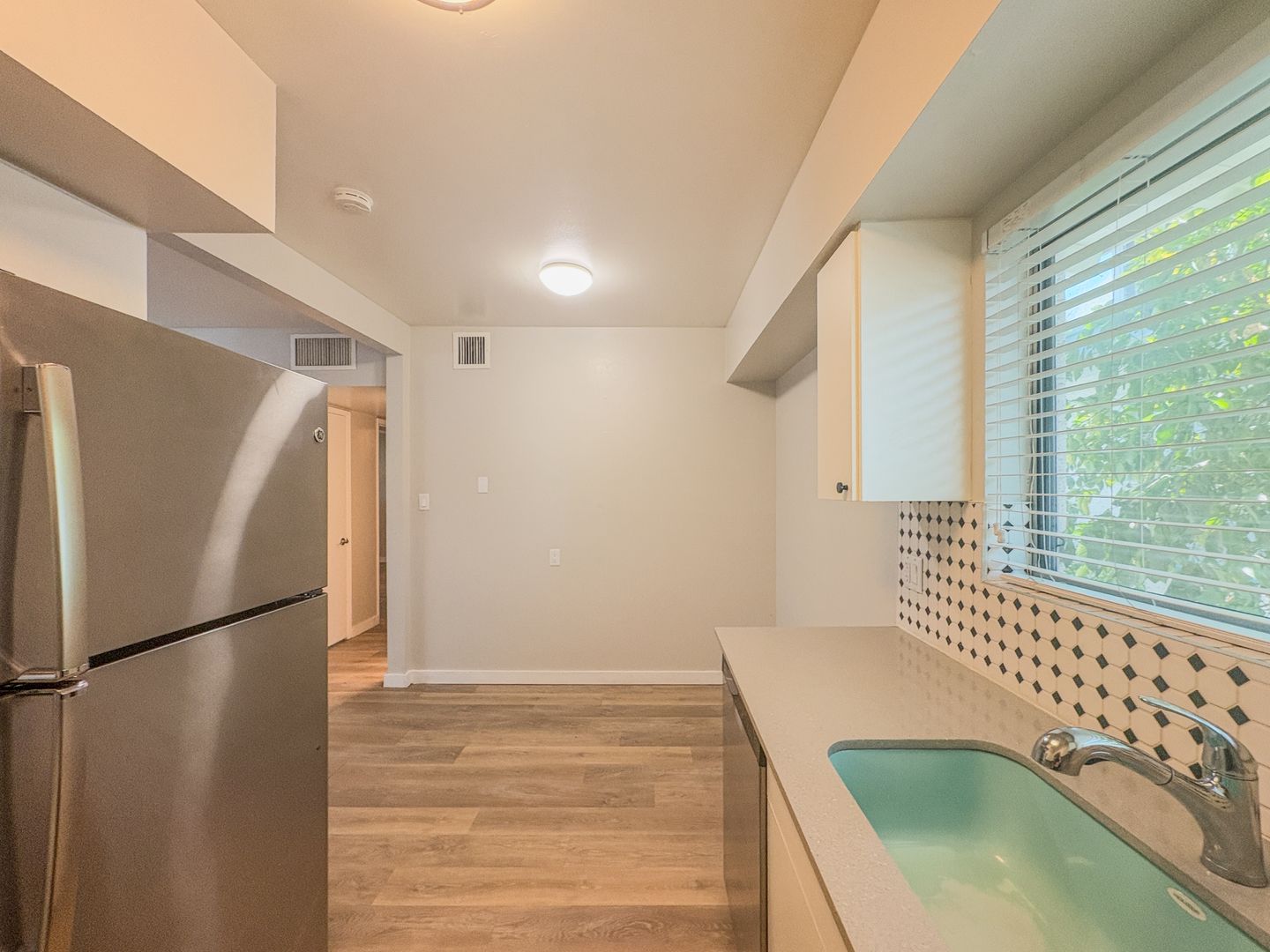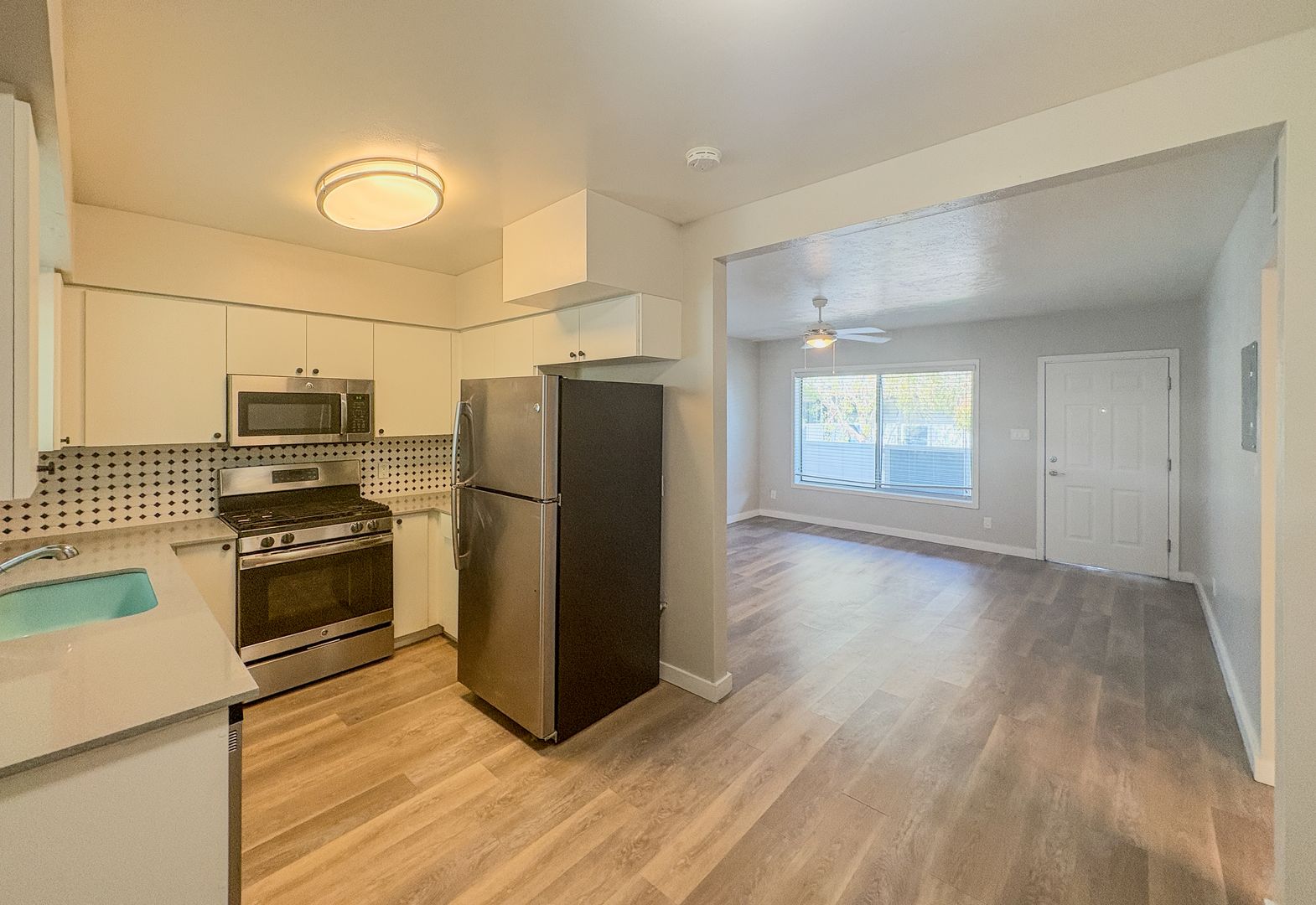 Step into a bright and open floor plan with wood-style flooring, fresh white paint, and modern ceiling fans throughout. The stunning kitchen features crisp white cabinetry, sleek quartz countertops, stainless steel appliances, and a unique black-and-white tile backsplash that adds a designer touch. Cook, entertain, and enjoy the natural light pouring through the oversized kitchen window.