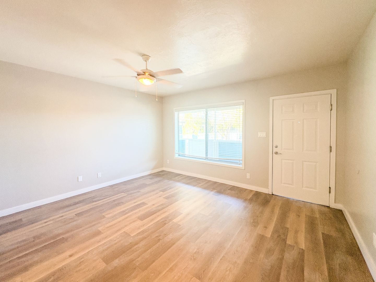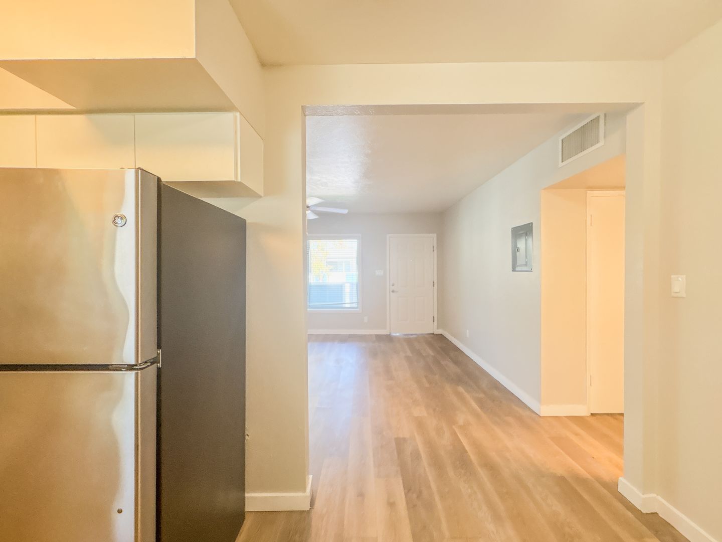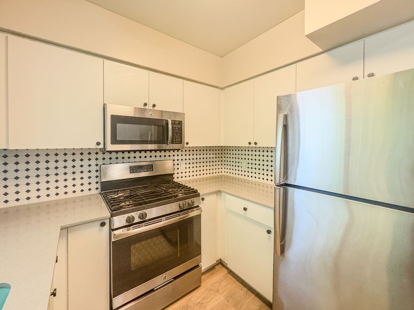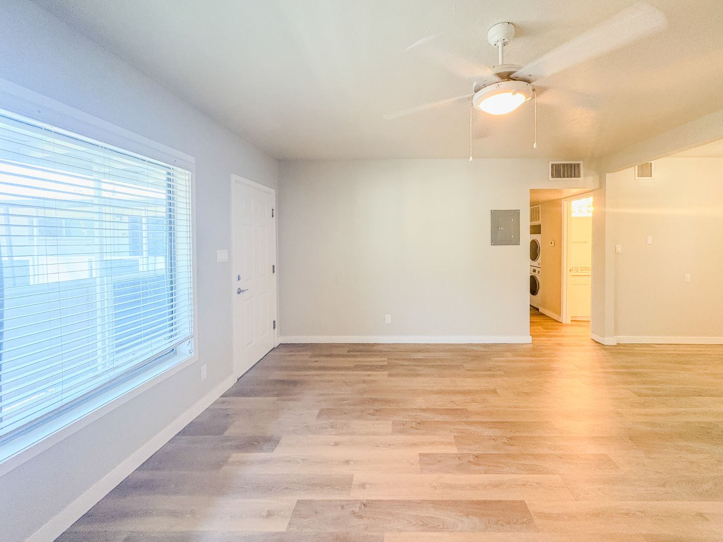 Step into a bright and open floor plan with wood-style flooring, fresh white paint, and modern ceiling fans throughout. The stunning kitchen features crisp white cabinetry, sleek quartz countertops, stainless steel appliances, and a unique black-and-white tile backsplash that adds a designer touch. Cook, entertain, and enjoy the natural light pouring through the oversized kitchen window.