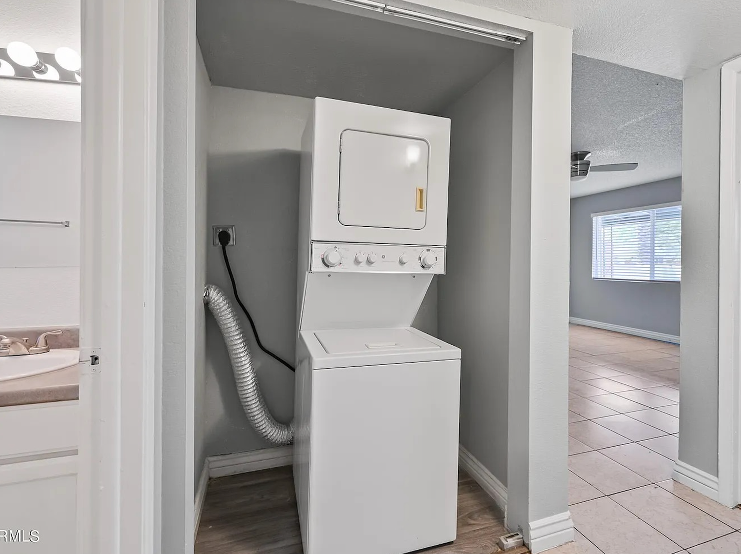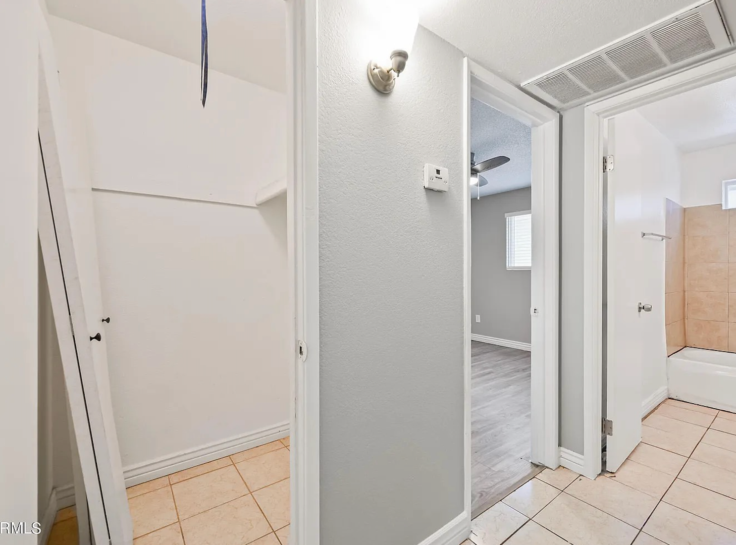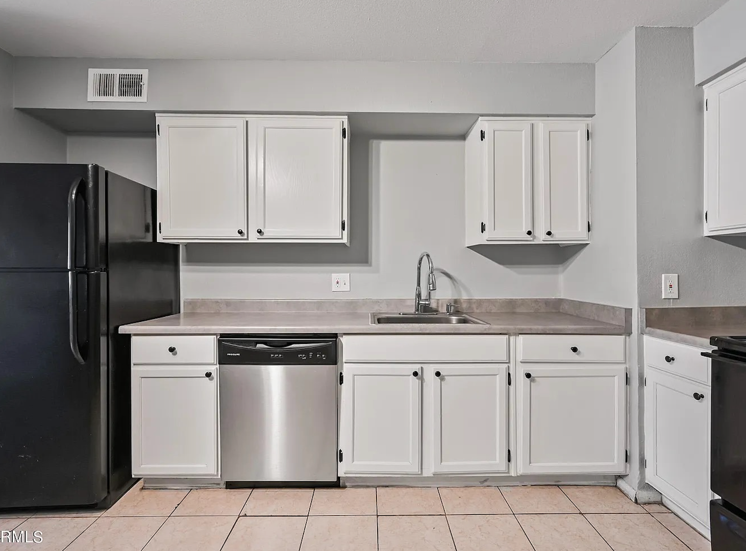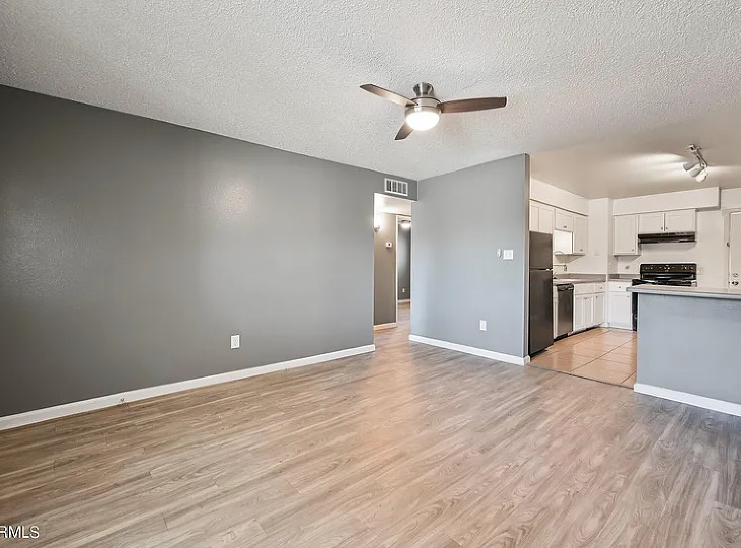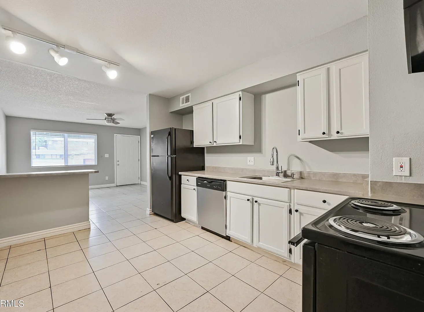 The kitchen offers ample cabinet space, durable countertops, and full-size appliances including a refrigerator, range, and dishwasher. The open living and dining area provides plenty of natural light, tile flooring, and modern ceiling fans, creating a comfortable space for relaxing or entertaining. The bedroom offers generous closet space and updated flooring, while the bathroom features clean, modern finishes.